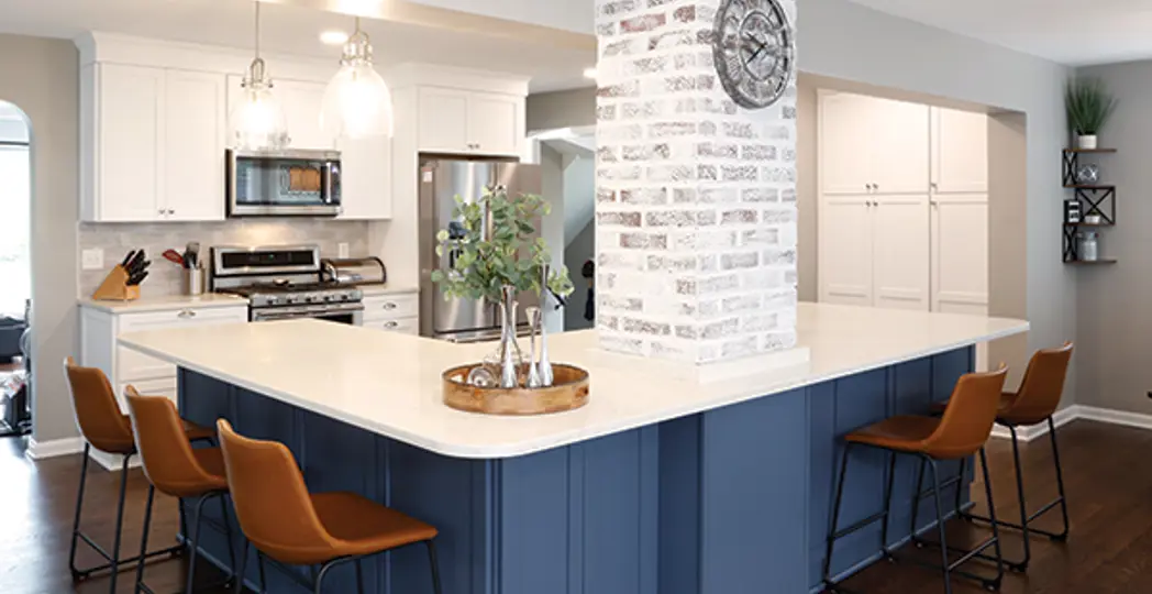 Two-toned cabinetry with painted wood in blues and greens for accent spaces are hallmarks of a warmer era for the kitchen. “White uppers and green base cabinets, white and navy — the two-toned look is definitely happening, and we are seeing this in bathrooms, too,” says Beth Orr, vice president at Dover Home Remodelers in North Olmsted. “We’re finally moving away from white-on-white and seeing some uniqueness that is more bold.”