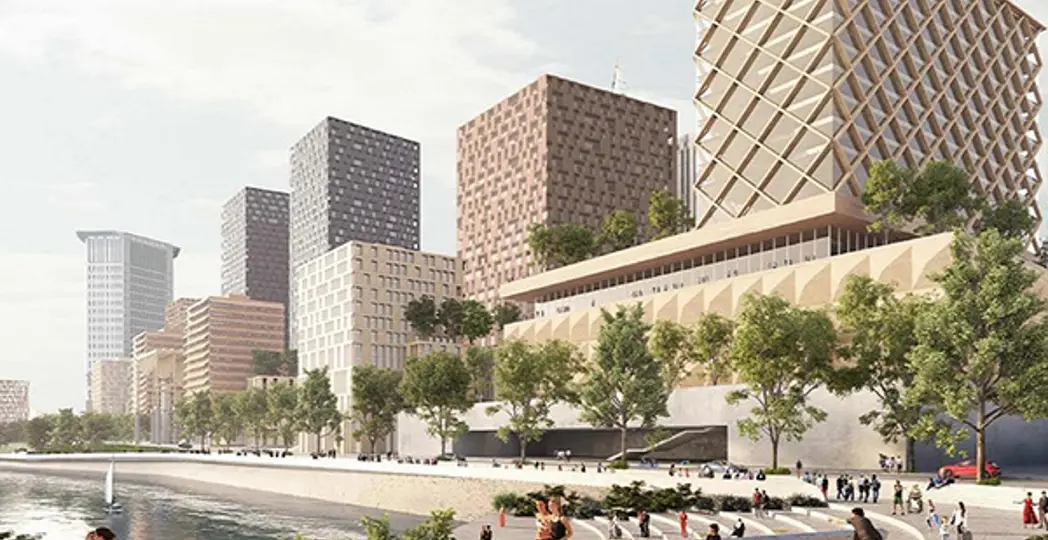 Several new mixed-use facilities comprised of office, residential, restaurant and retail buildings are planned along the riverfront in the next phases, too. A brand of housing is proposed but its identity was blanked out by state officials.