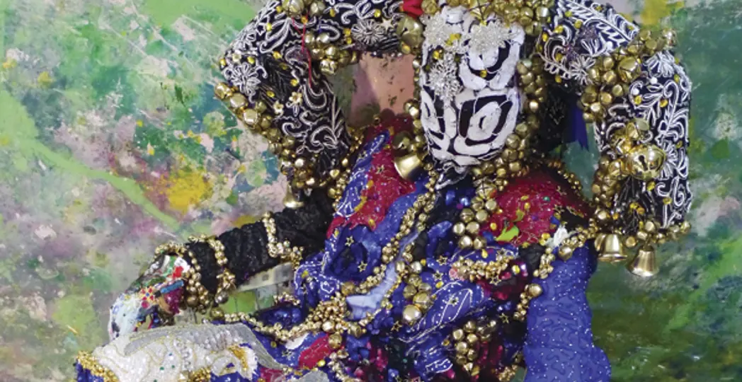 At the 2017 Whitney Biennial in New York City, Raul de Nieves’ work was impossible to miss. A 50-foot, 18-panel stained glass window he created overlooked several of his whimsical, humanoid sculptures crafted with plastic beads and vibrant fabric. A closer look at the stained glass, however, revealed a surprise: De Nieves crafted the panels using colored cellophane, with subtle paper, wood and beaded accents.