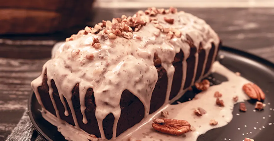 Preheat oven to 350 degrees. Cream 1 cup room-temperature butter and 1 cup brown sugar until completely smooth. Mix in 4 eggs and whisk until smooth. Add 1 cup flour, 3/4 cup cocoa, 3/4 teaspoon baking powder, 1 teaspoon kosher salt, 1/3 cup buttermilk, 1 teaspoon espresso, 2 teaspoons vanilla extract and 1/8 teaspoon chile powder and fold with a rubber spatula until combined. Spray a loaf pan or line the bottom with parchment paper and fill with batter. Drizzle 1/2 cup melted pecan butter over top. Bake for 55 minutes. Let cool at least 1 hour. Run a butterknife or offset spatula around the pan to loosen the sides, flip your pan upside down over a plate and flip back over to frost. Whisk together 1 cup powdered sugar, 1 teaspoon vanilla extract, 1 and 1/2 tablespoons milk and 1 tablespoon pecan butter and pour over loaf cake. Decorate with 1/2 cup roughly chopped pecans, 1/2 cup roughly chopped dark chocolate chunks or chips and 1 teaspoon kosher salt.