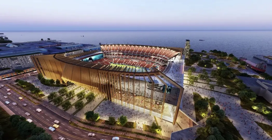 “I’m glad that it (the rendering) is out there,” Griffin said, adding he didn’t release it. “People can actually see that it complements the existing lakefront and actually has more usage and connections to the existing lakefront than the Brook Park plan does to its surroundings. Ergonomically, this design is less affected by the elements than the current stadium.”